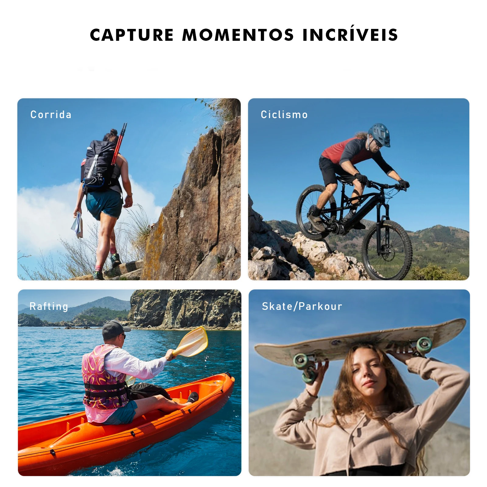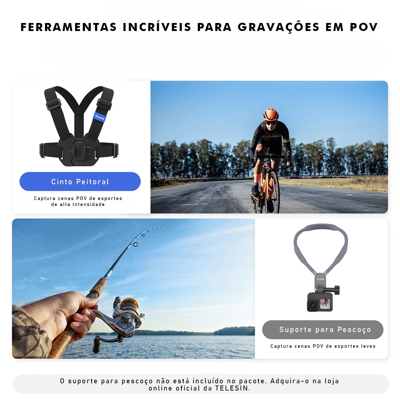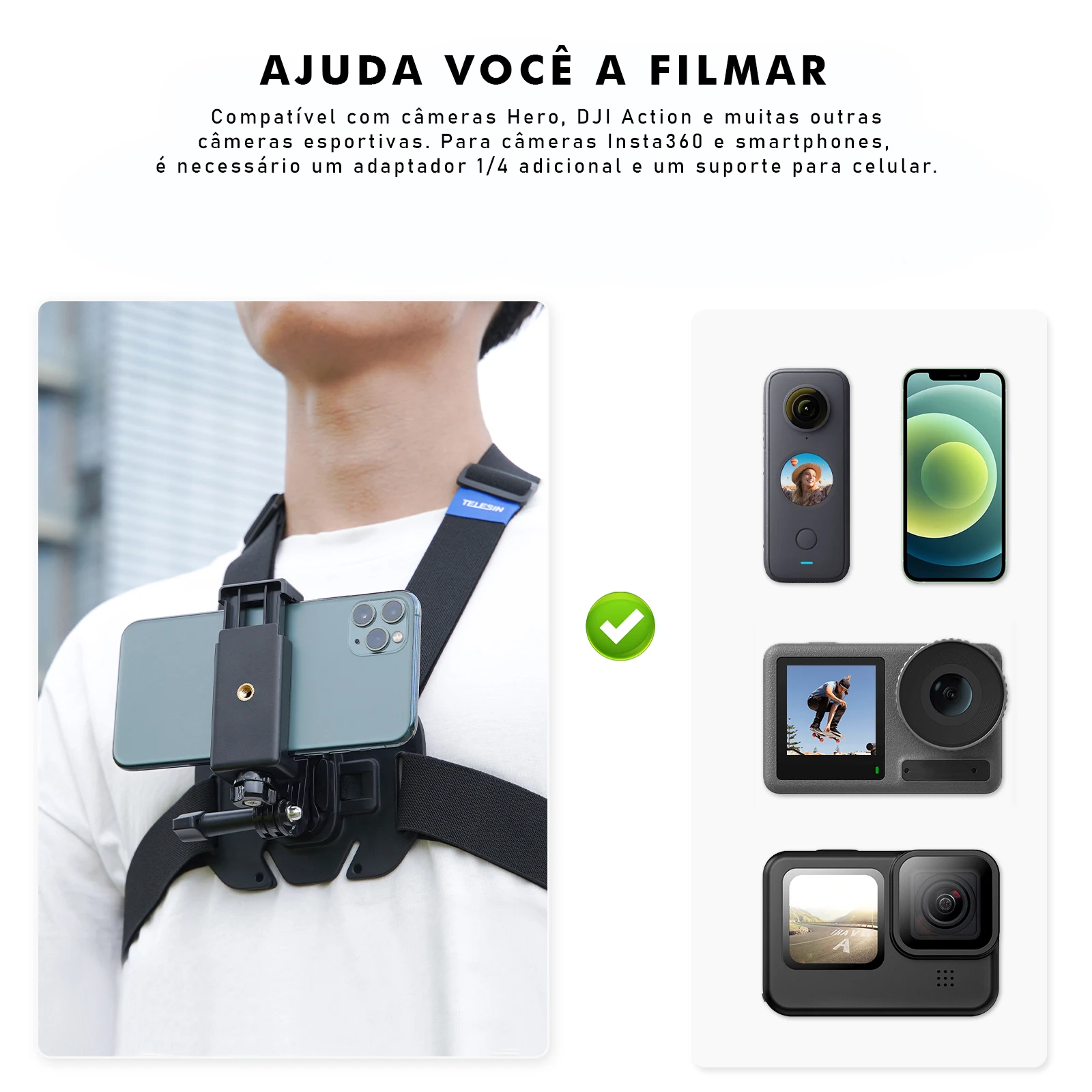 Compatibilidade universal: compatível com GoPro Hero, DJI Action, Insta360 (com adaptador) e smartphones, usando a base J-Clip rápida incluída.