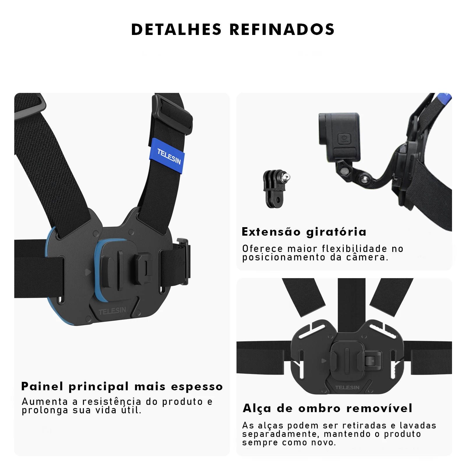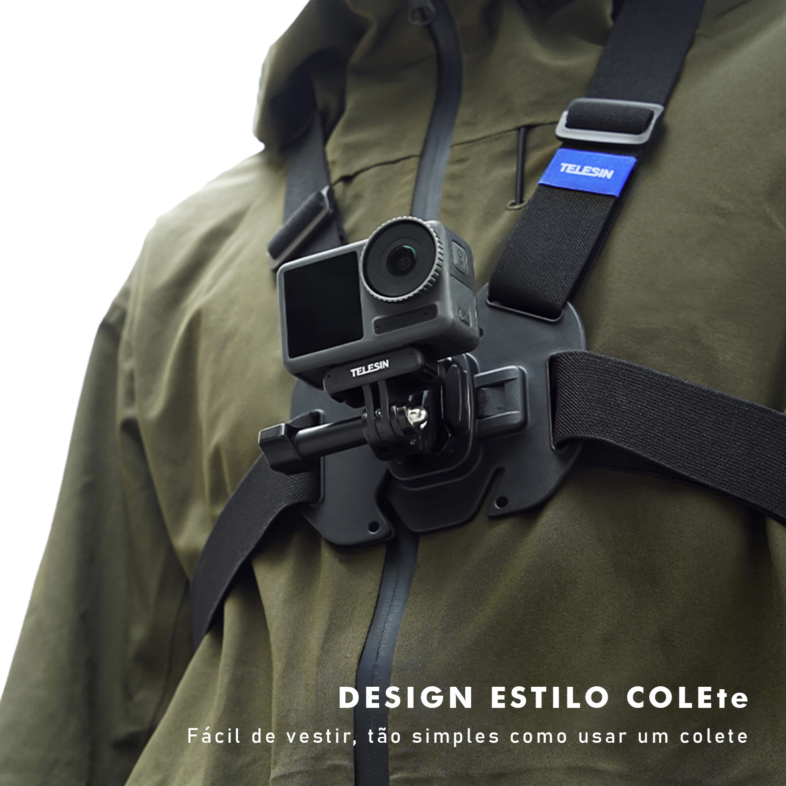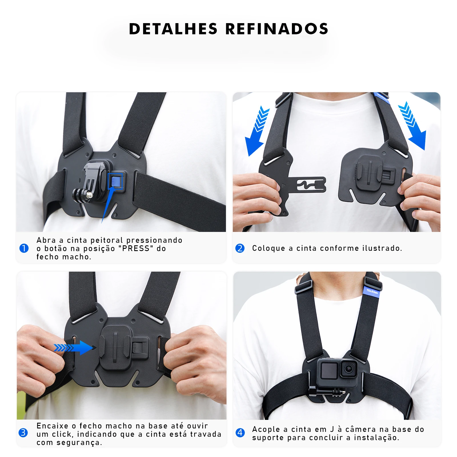 Compatibilidade universal: compatível com GoPro Hero, DJI Action, Insta360 (com adaptador) e smartphones, usando a base J-Clip rápida incluída.